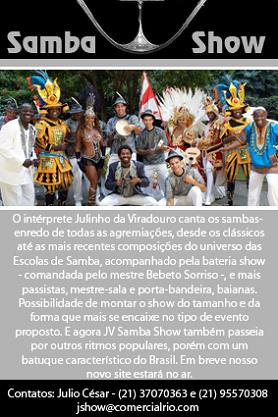 O Grupo JV SAMBA SHOW é uma mini Escola de Samba coordenada pelo intérprete Julinho da Viradouro. Contém os melhores ritmistas de variadas Escolas do Grupo Especial do carnaval carioca, bem como Mestre-Sala e Porta-Bandeira, Baianas, Cavaquinista e as mais belas passistas do Rio de Janeiro.