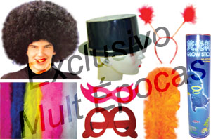 Como Pulseira de néon, Colar pisca, Colar havaiano, Chapéu, Máscara, Tiara, Pluma, Marabú, Estola, Fantasia, Óculos, Peruca e muito mais.