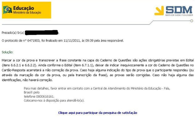 No entanto, Jorge Luiz Barbosa Junior, de 18 anos, entrou em contato com a central de atendimento do MEC e recebeu nesta sexta a resposta de que sua prova será corrigida. Ele esqueceu de transcrever a frase para o cartão de respostas no primeiro dia do Enem, que foi aplicado em 22 e 23 de outubro em todo o País. ?No sábado o fiscal não falou nada sobre a frase, só no domingo?, diz.